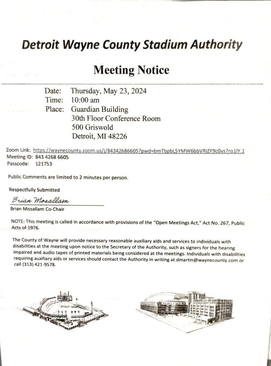Detroit/Wayne County Stadium AuthorityGuardian Building, 500 Griswold St, 30th Floor Conference Room, Detroit, MI 48226 (Directions)